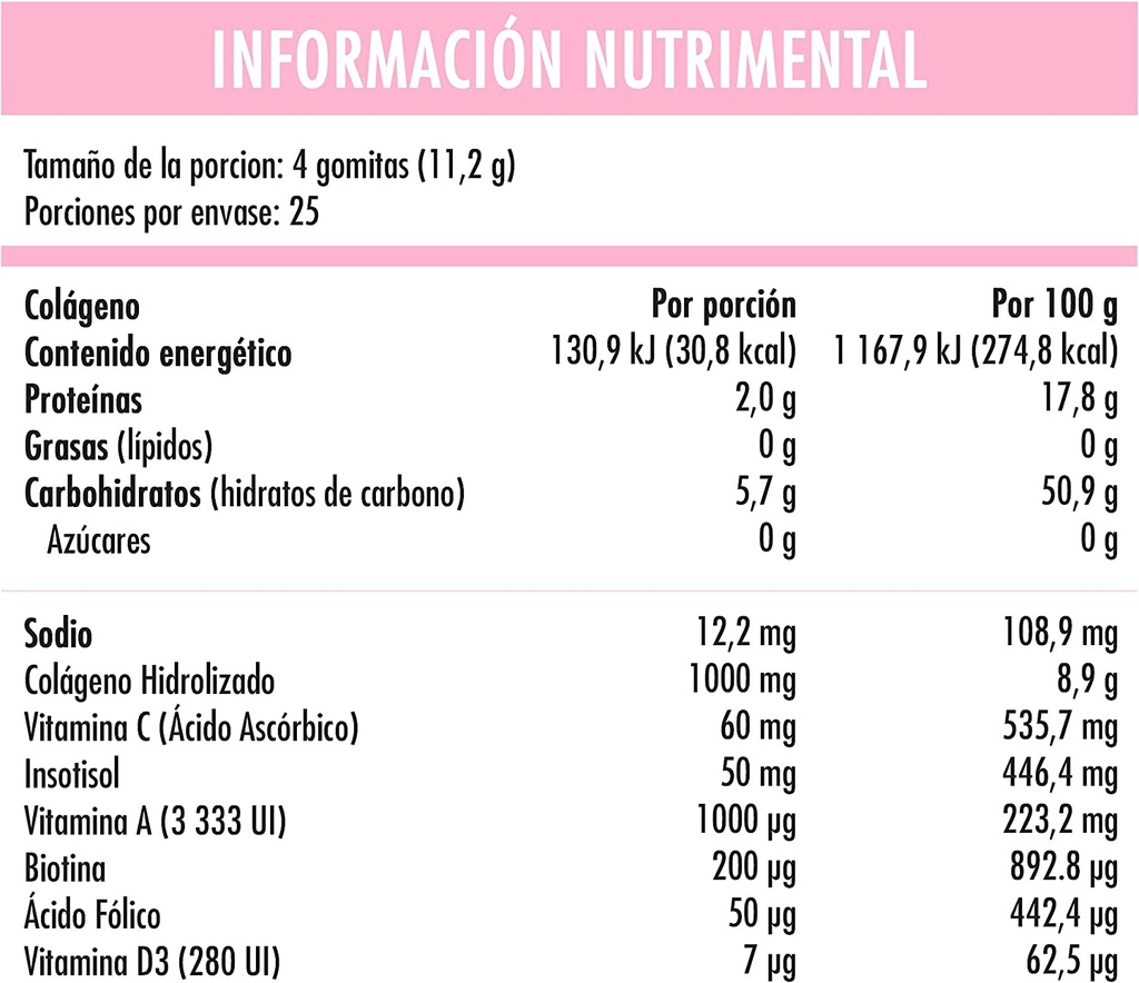 INGREDIENTES: Jarabe de Glucosa, Azúcar, Agua Purificada, Grenetina, Colágeno Hidrolizado, Ácido Cítrico, Vitamina C (Ácido Ascórbico), Pectina, Citrato de Sodio, Sabor Natural de Fresa, Jugo Natural de Betabel (Como Colorante), Vitamina A (Acetato de Retinol), Ácido Fólico, Biotina, Vitamina D3 (Colecalciferol), Cera de Carnauba (Como abrillantador).